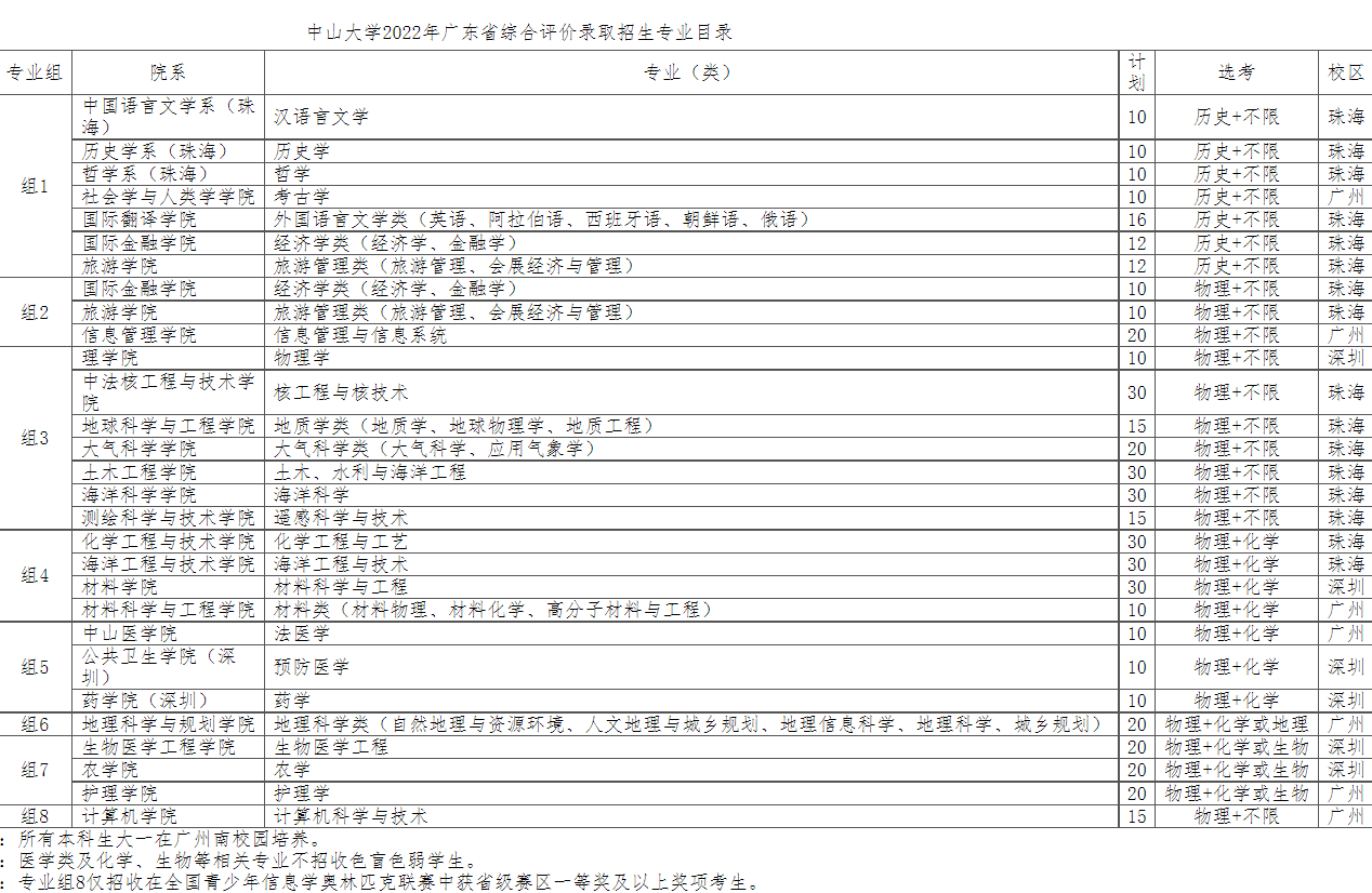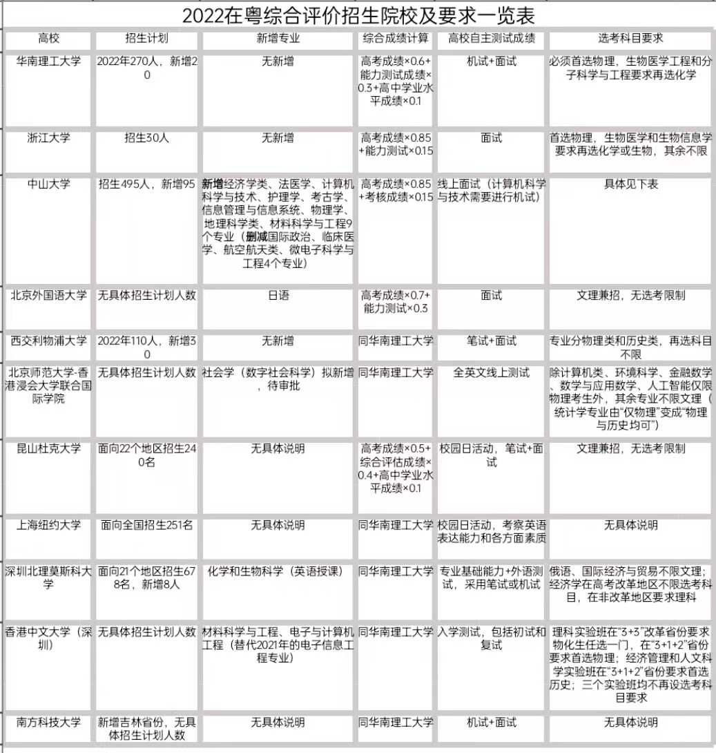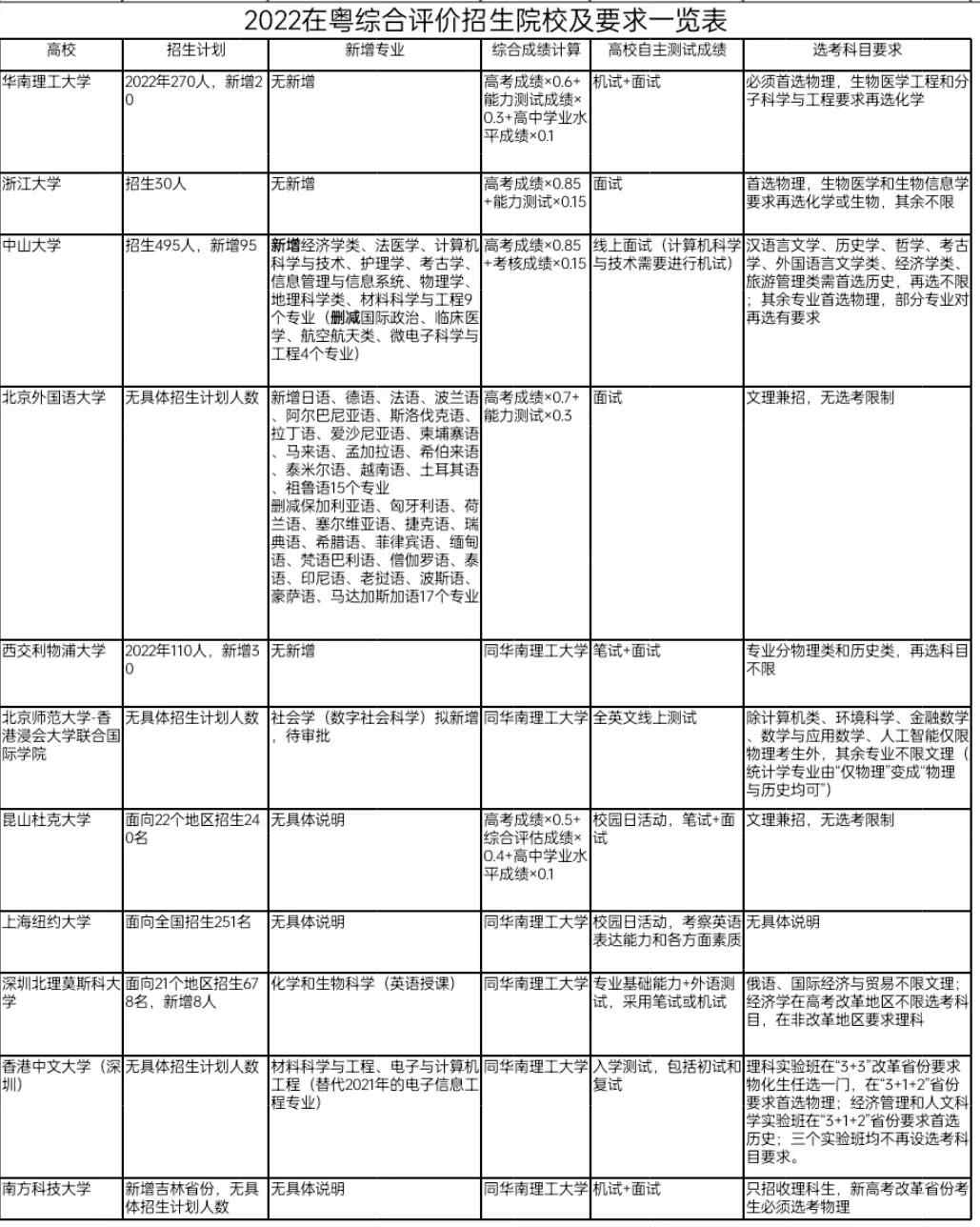 5月16日,随着浙江大学正式发布2022年广东省综合评价招生录取简章,标志着2022年11所在粤开展综合评价试点的高校均已公布招生录取简章。值得注意的是,2021年暂停综合评价招生录取的中山大学今年“卷土重来”,同时,不少高校在招生计划、专业、选考科目要求等方面都有所调整。