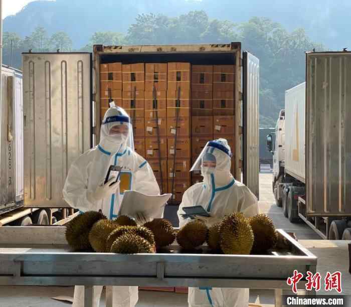 疫情下,友谊关海关关员正在对进口榴莲进行查验。 邓光平 摄