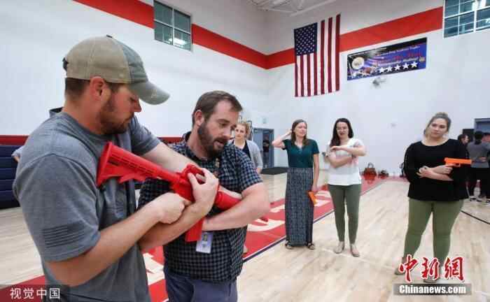 资料图:美国犹他州一所学校的教师,学习如何解除枪手的武器并反击。图片来源:视觉中国
