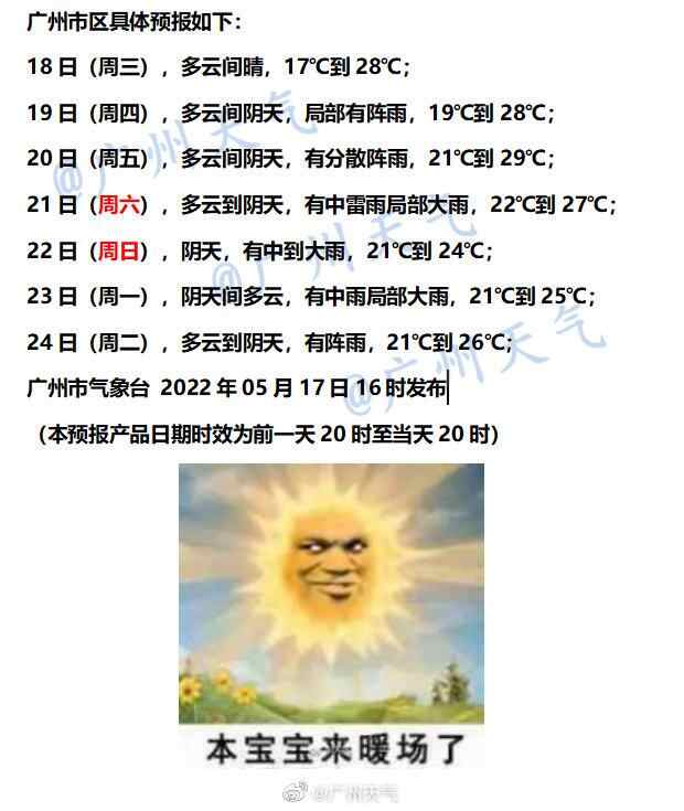 据@广东天气预计,今日广东大部晴到多云;19-20日全省多云到阴天,部分市县有阵雨。
