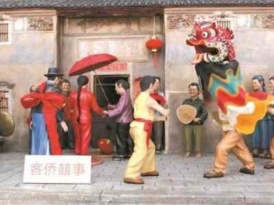 《客侨喜事》占据了约5平方米的空间,立体地呈现了凤岗客家婚礼场景。其中,既有凤岗碉楼、篆香书室、观合楼、客家围屋等独具凤岗客家特色的历史建筑,也有踩米筛、送七朝、舞麒麟、龙泉注童等客家婚礼习俗表演。