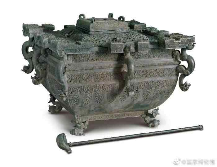 青铜冰鉴:据介绍,这件青铜冰鉴是由一个方鉴和一件方尊缶组成的青铜套器,与之配套的还有一把长柄青铜勺。从造型上看,该青铜冰鉴体态厚重,结构精巧。
