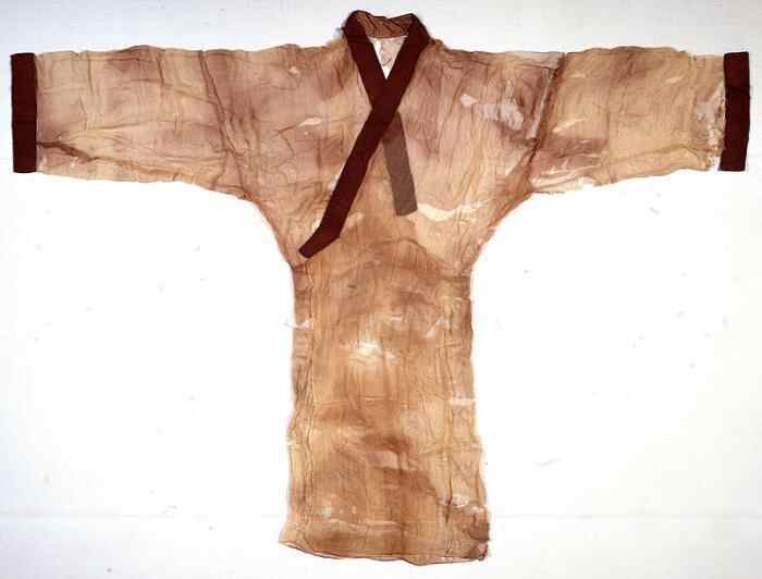 素纱单衣(直裾):此件素纱单衣为交领,右衽,直裾。面料为素纱,边缘为几何纹绒圈锦。