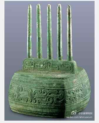 被称为“西周路由器”的文物“云纹铜五柱器”。图片来源:安徽博物院微博