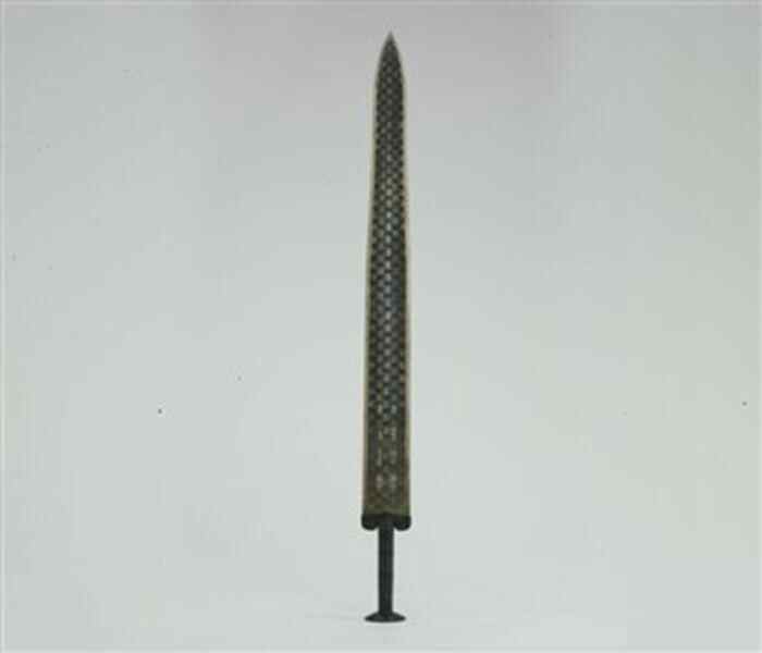 越王勾践剑:1965年12月出土于湖北江陵望山一号楚墓,造型高贵、典雅。这把剑在出土时插在漆木剑鞘里,出鞘时仍然寒光闪闪,耀人眼目。