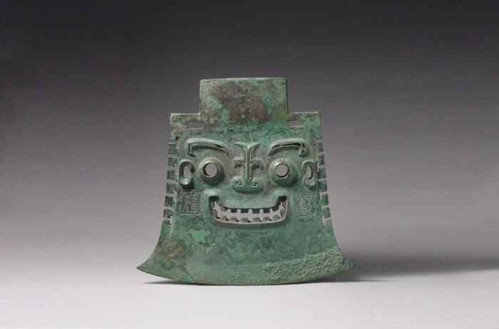 亚醜钺:这件珍宝器身透雕人面纹,人面五官微突出,双目圆睁,嘴角上扬,口中露出城墙垛口似的牙齿,极富威严。因其口部两侧对称地铭有“亚醜”二字,故得名“亚醜钺”。
