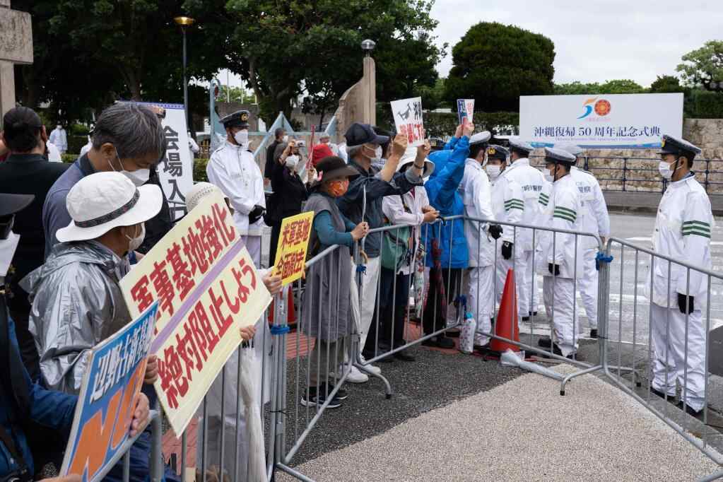 5月15日,在日本冲绳,人们在活动现场外抗议。新华社记者张笑宇摄