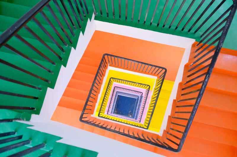 从红砖外墙穿过,进入文创园中庭,一座旋转楼梯映入眼帘,玻璃墙打造出通透而有界限的空间感。