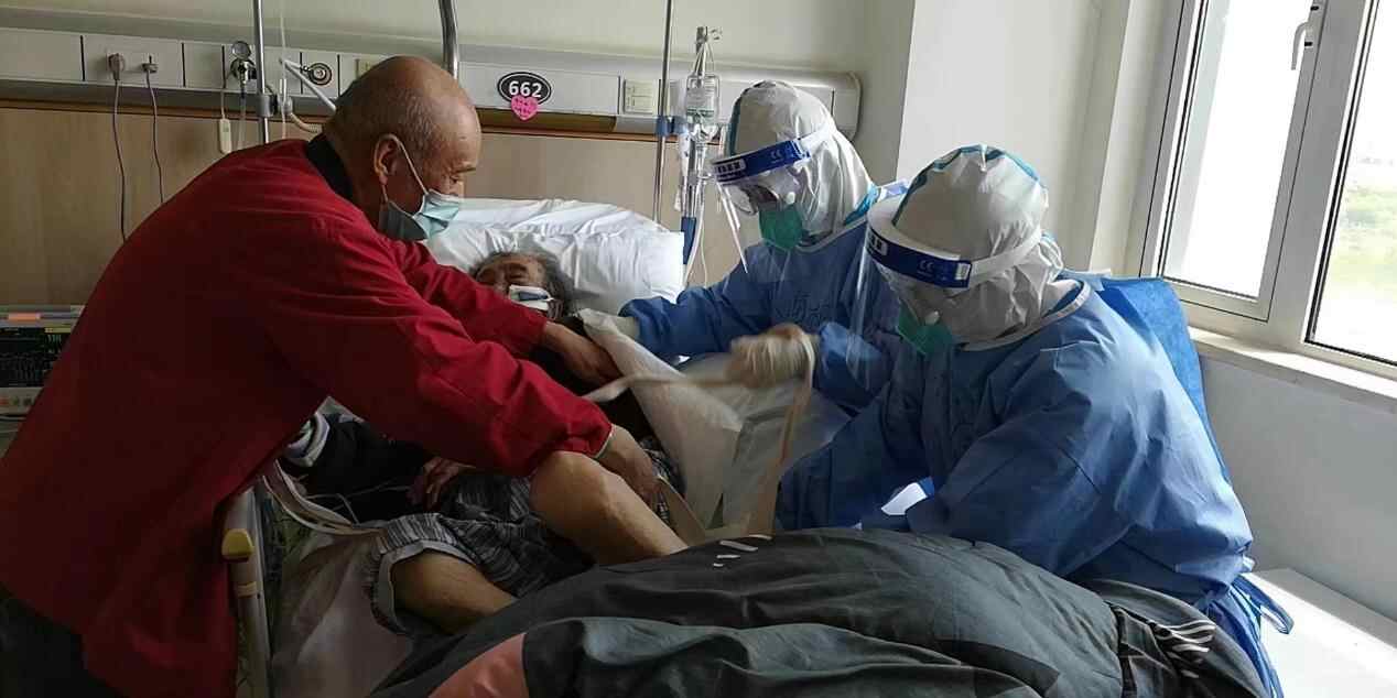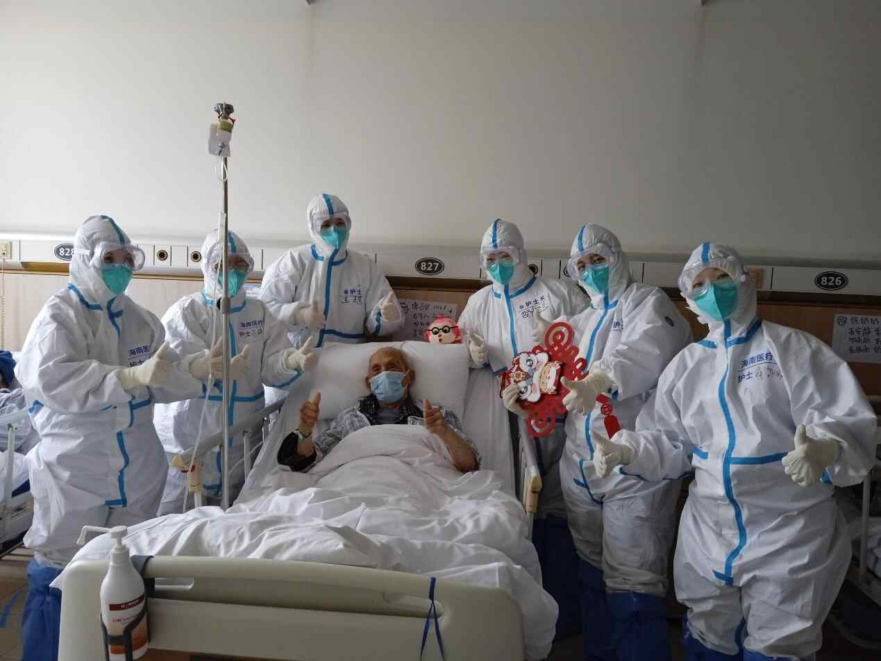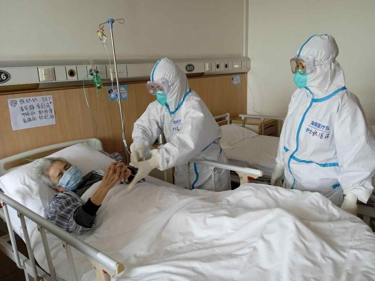 瑞金医院北院里,102岁的患者经过海南医疗队医护人员的护理,病情逐渐好转