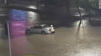 当天凌晨时分,暴雨如注,低洼路面的积水迅速上涨。深圳市龙岗交警大队龙城中队铁骑队员马云丽看到积水中停着一辆车,车里的司机明显有些慌乱,她连忙上前查看情况并询问:“你怎么回事啊?”“我怎么办呢?”司机焦急求助。“你挂着空挡,我帮你推车,不然等下你的车就要报废了。”