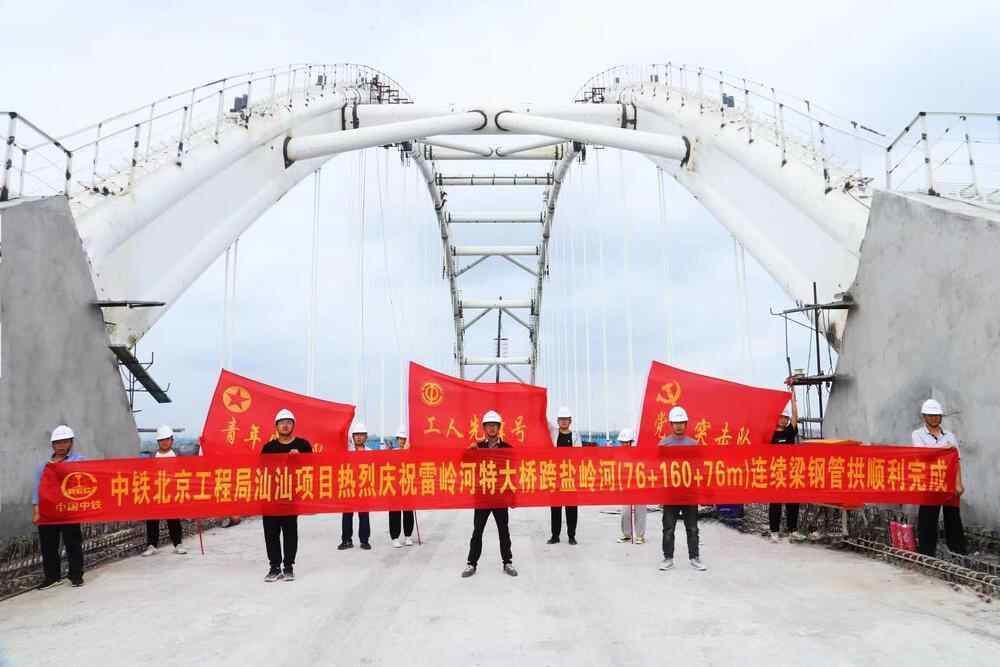 5月21日16时许,由中铁北京工程局承建的汕汕高铁项目雷岭河特大桥跨盐岭河160米连续梁钢管拱全部完成,为后续架梁及无砟轨道施工奠定了坚实的基础。