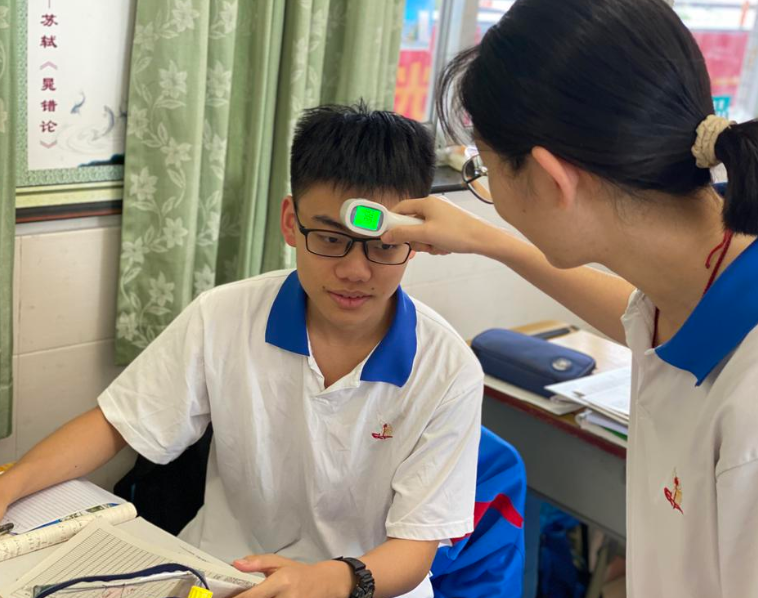据铁一越秀校区高三1班班主任程思永老师介绍,铁一的走读生每天早晨上学前在家进行自广州健康监测,结果可以马上通过公众号进行申报;住宿生每天早晨到班后,利用每个课室配备的测温仪进行健康监测,结果上报班主任并由班主任代为申报。家在外市的考生需返回广州候考,学校会为这些有需求的考生提供宿位,也允许相关家长凭48小时核酸阴性证明到校看望。高考前,全体考生不离穂。