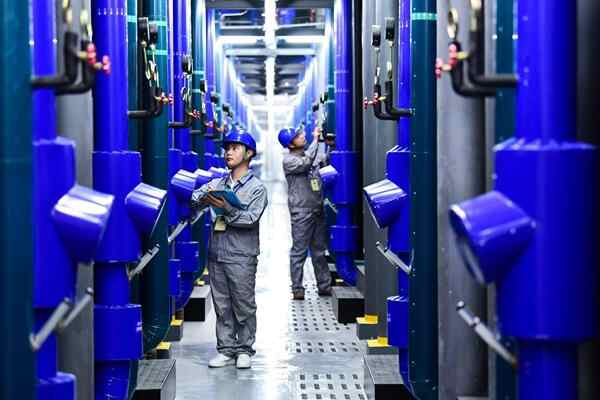 中国联通贵安云数据中心技术人员在机房室内巡检微模块进出水管阀门压力表。图为中国联通在南方建设的最大云数据中心。陈慧摄