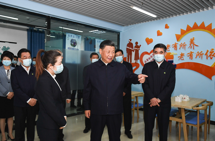 2021年6月7日至9日,中共中央总书记、国家主席、中央军委主席习近平在青海考察。这是7日下午,习近平在西宁市城西区文汇路街道文亭巷社区幸福食堂,了解社区向老年人提供餐饮服务情况。新华社记者 燕雁摄