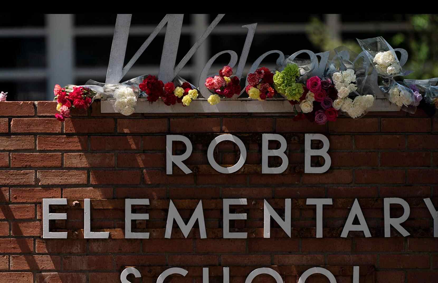 5月25日,得克萨斯州乌瓦尔德市罗伯小学门外放满了纪念的鲜花。(图源:美联社)