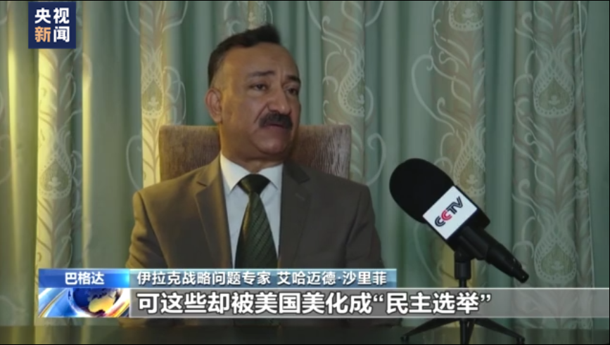 伊拉克战略问题专家 艾哈迈德·沙里菲:美国空喊民主口号,我们没有看到任何成果,实际情况甚至与美国提出的口号截然相反。恐怖主义滋生,基础设施被破坏,政治前景不明,腐败问题横行,管理制度混乱,可这些却被美国美化成“民主选举”变成所谓的“民主进程”。