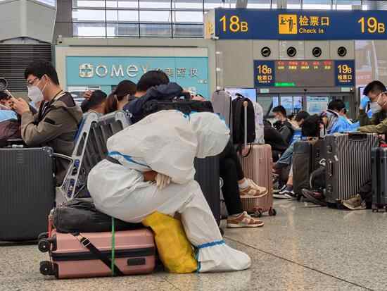 穿着防护服的多数是学生,三五成群坐在地上或行李箱上。在出发前,多数学校都给学生们免费发放了N95口罩和橡胶手套,有些学校提供了防护服。
