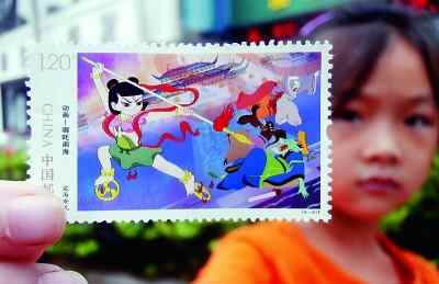 一名小朋友在江苏苏州邮政局展示《动画—哪吒闹海》特种邮票。王建康摄/光明图片
