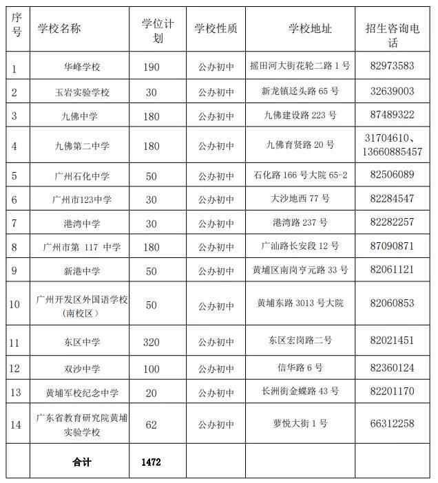 2022年黄埔区初中一年级“积分制入学”学位计划表