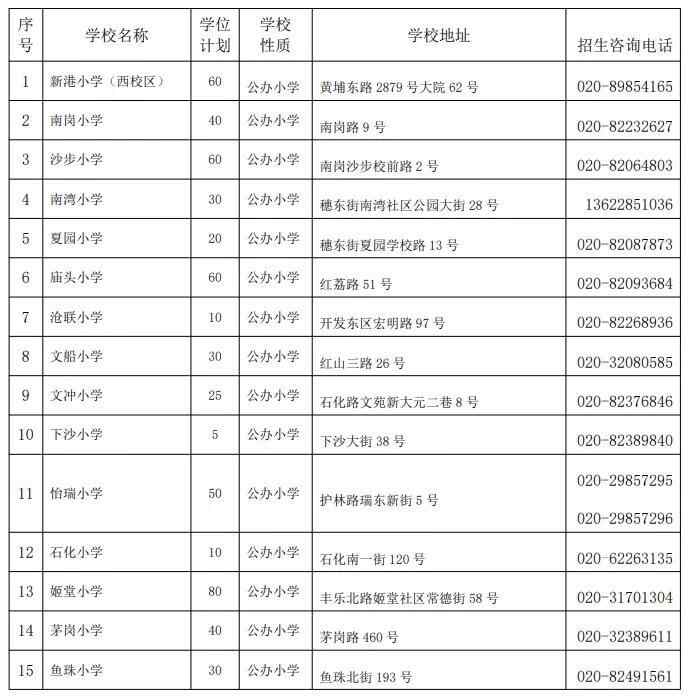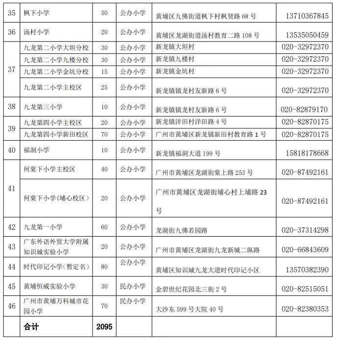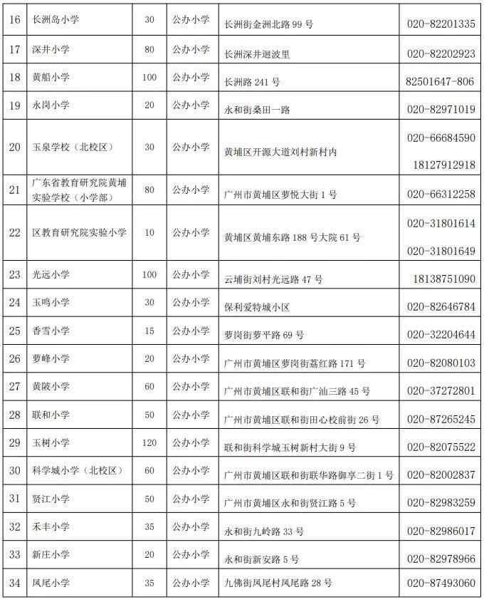 2022年黄埔区小学一年级“积分制入学”学位计划表