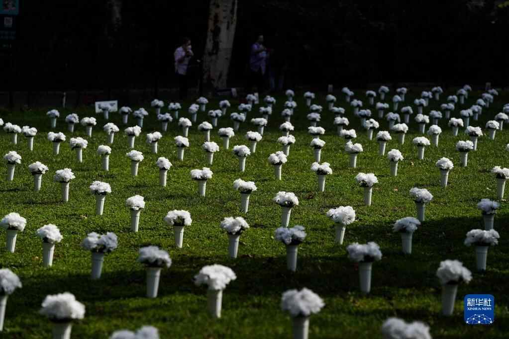这是2021年10月8日在美国纽约炮台公园内拍摄的为悼念枪支暴力遇难者摆放的白色瓶花。据主办方介绍,这个由1050个白色瓶花组成的大型纪念装置旨在悼念2020年在纽约州死于枪支暴力的1050名受害者,呼吁政府针对枪支暴力采取行动。新华社记者 王迎 摄