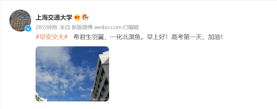复旦大学、上海交通大学在官方平台晒出学校照片,并祝福考生“心之所向,梦之所达!高考加油!”北京航天航空大学则在官微以宣传视频的形式为考生加油助威,鼓励考生“志存高远,不负青春,未来自有答案,祝每位考生圆梦今夏,加油!”