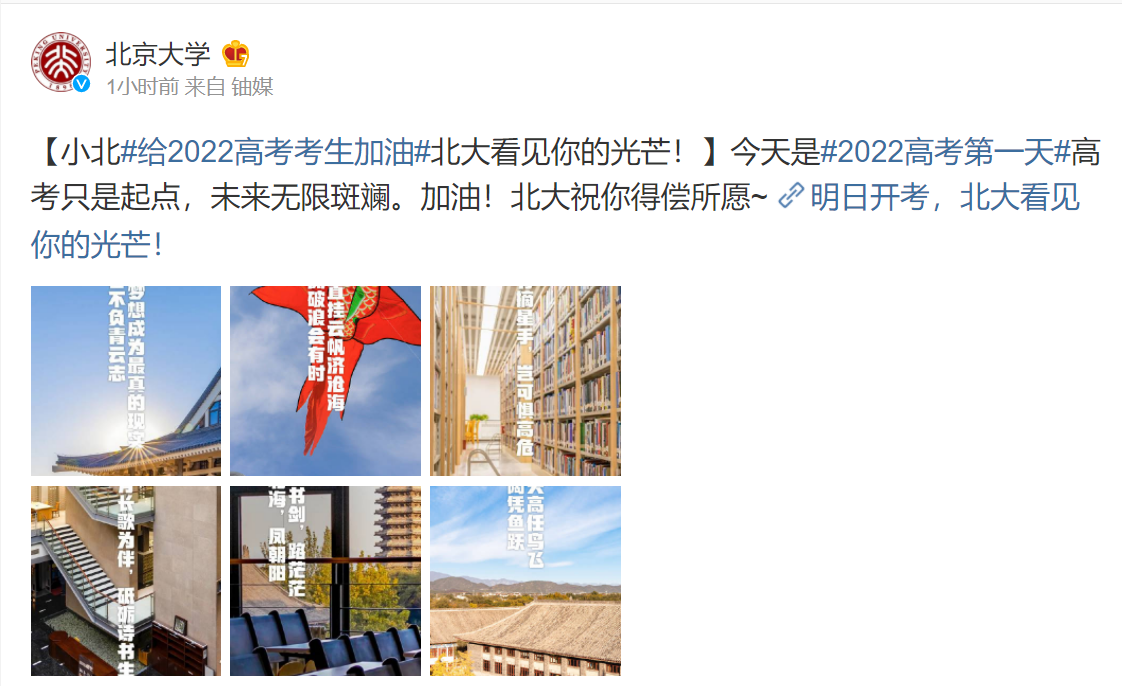 6月7日,2022年全国夏季高考如期而至,今年共有1193万考生奔赴考场,比去年增加115万,再创历史新高。又是一年高考时,在这个特别的时刻,全国高校以官方微信、微博为渠道,纷纷为高考考生花式送祝福。