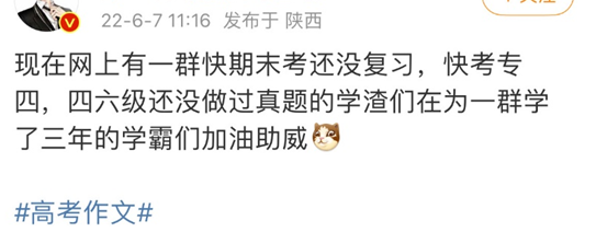 ⑥ “现在网上还有一群快期末考还没复习,快考专四,四六级还没做过真题的学渣们在为一群学了三年的学霸们加油助威”