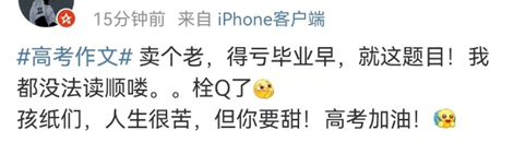 ⑨ “卖个老,得亏毕业早,就这题目!我都没法读顺喽。。栓Q了 孩纸们,人生很苦,但你要甜!高考加油!”