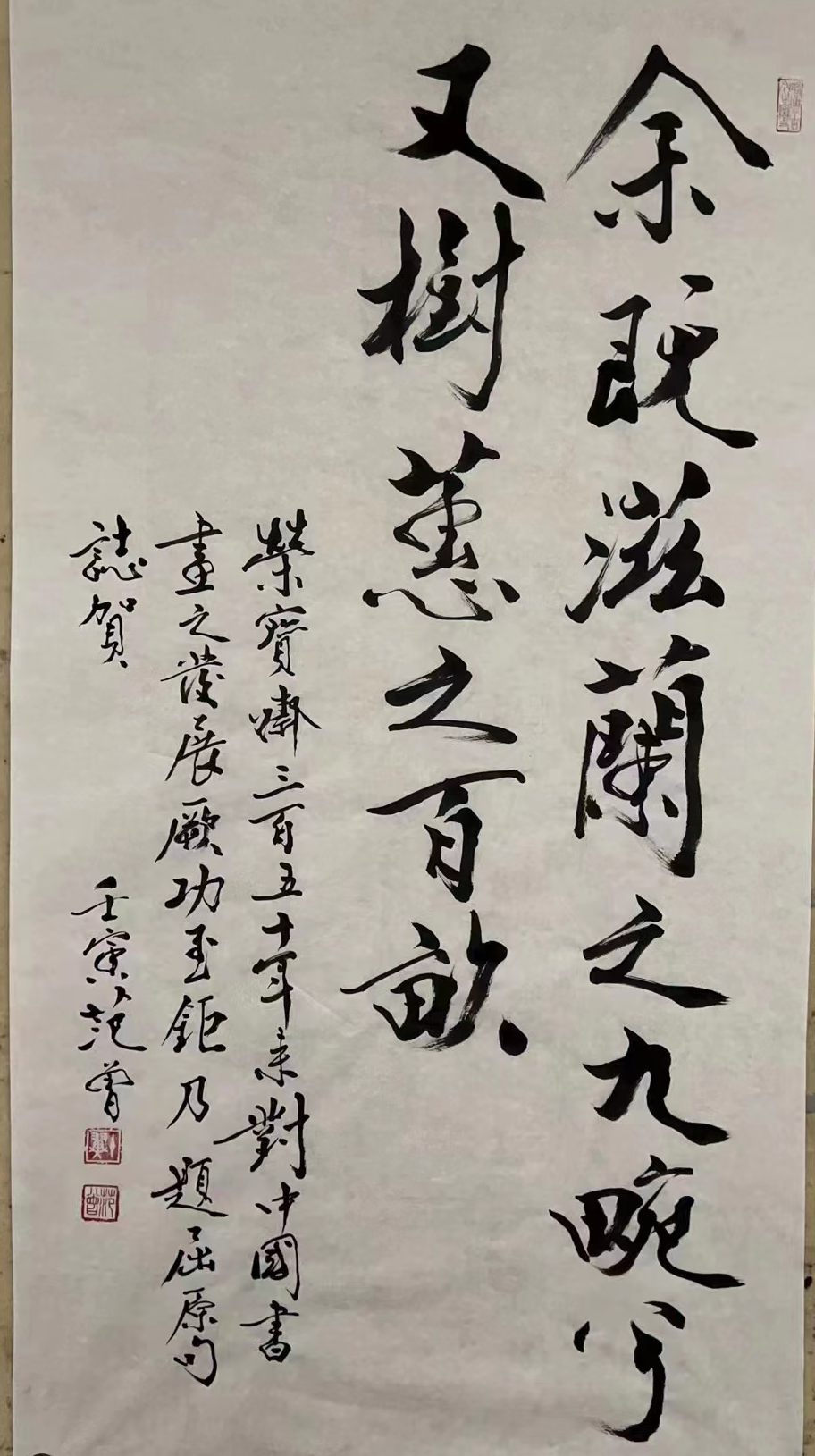 这幅书法作品是范曾先生为庆贺荣宝斋350岁生日特别创作,以此为荣宝斋350周年献上一份贺礼。