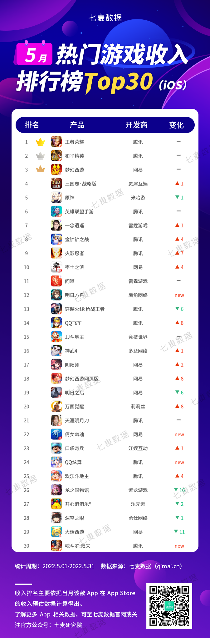 近日,七麦数据发布了 2022 年 5 月热门游戏排行榜,包含游戏下载榜和游戏收入榜。