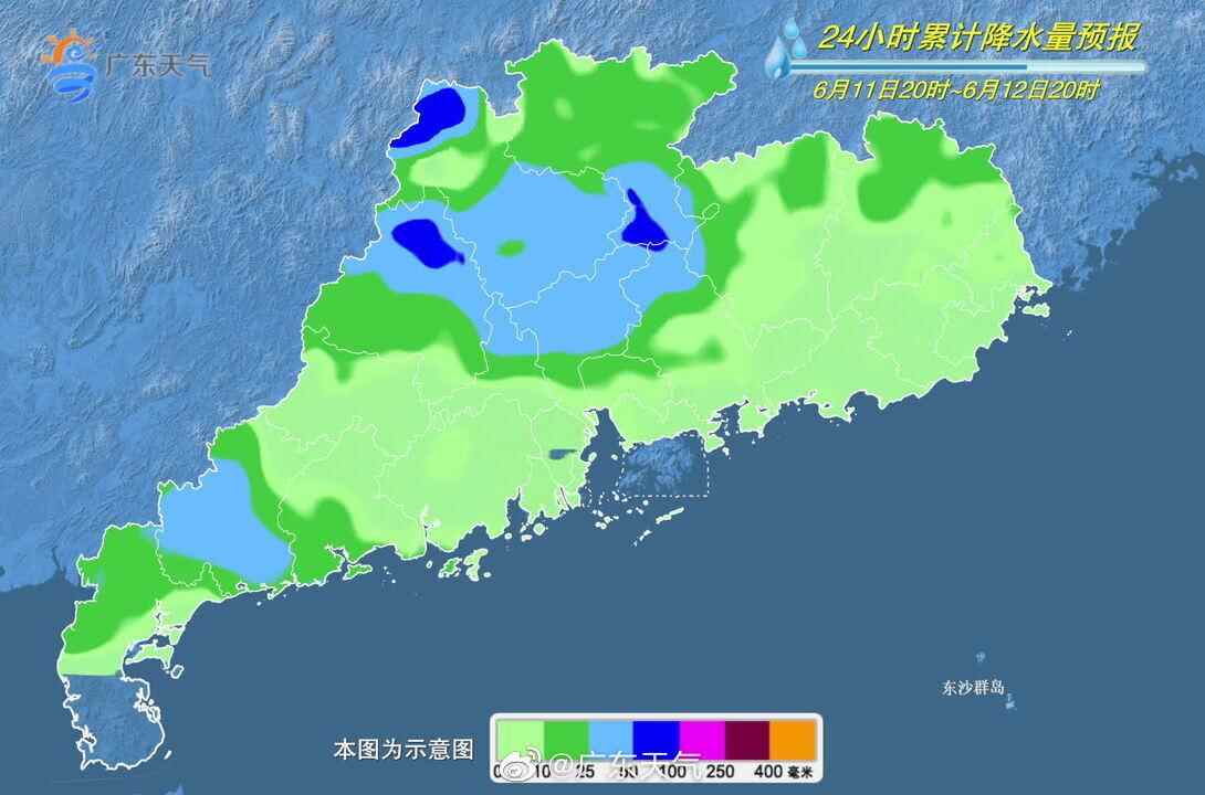 11日,粤西和珠江三角洲南部市县有大雨局部暴雨或大暴雨,韶关、清远和珠江三角洲的中北部市县有中到大雨局部暴雨,其余市县有(雷)阵雨局部大雨。