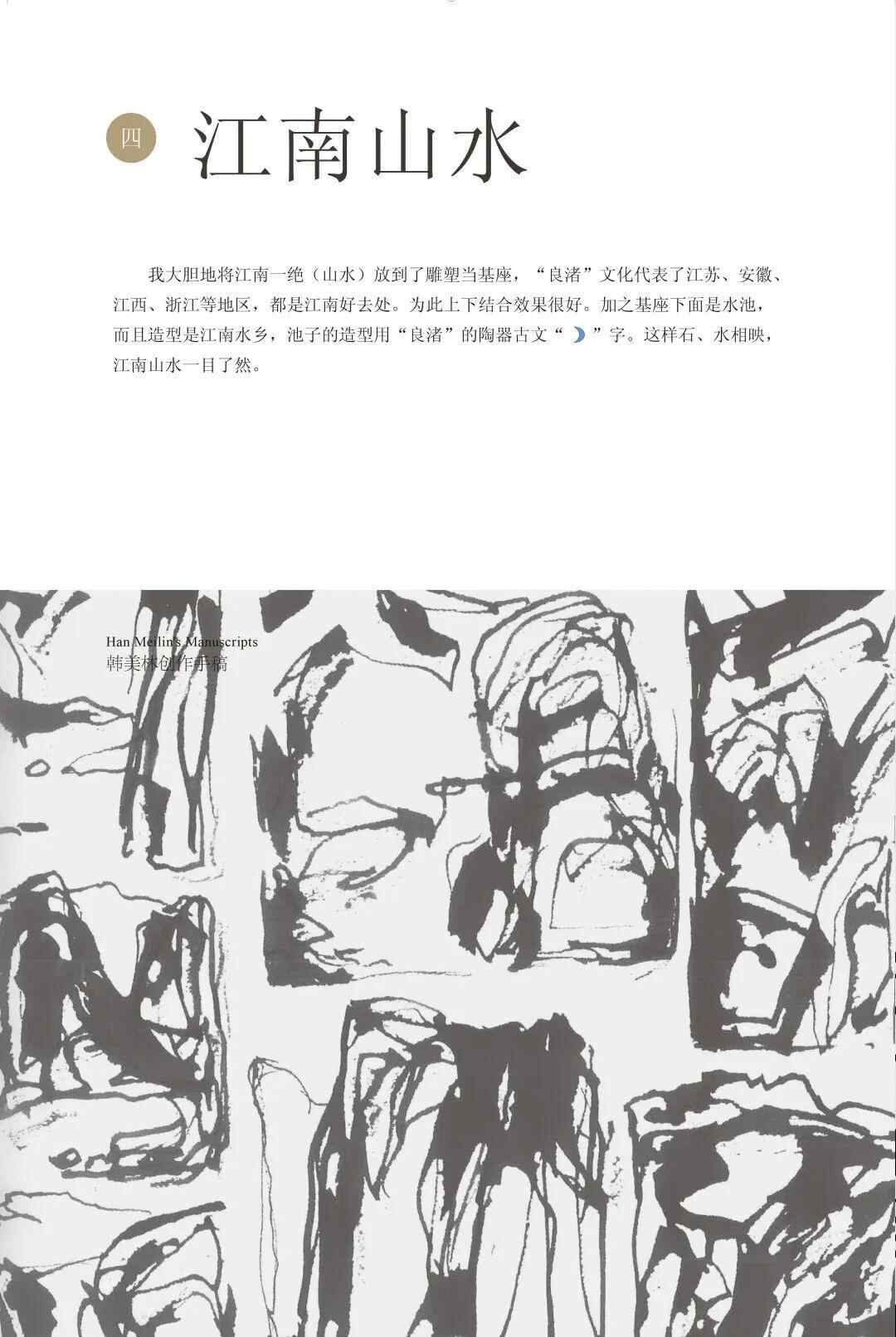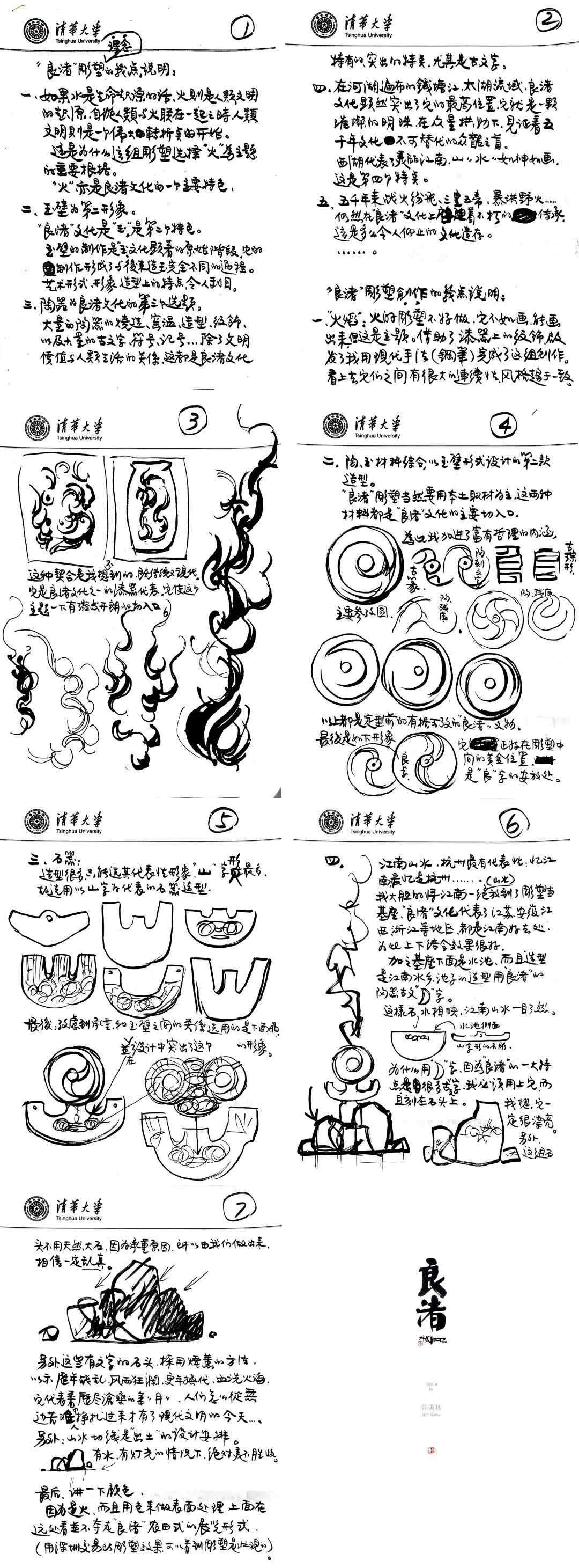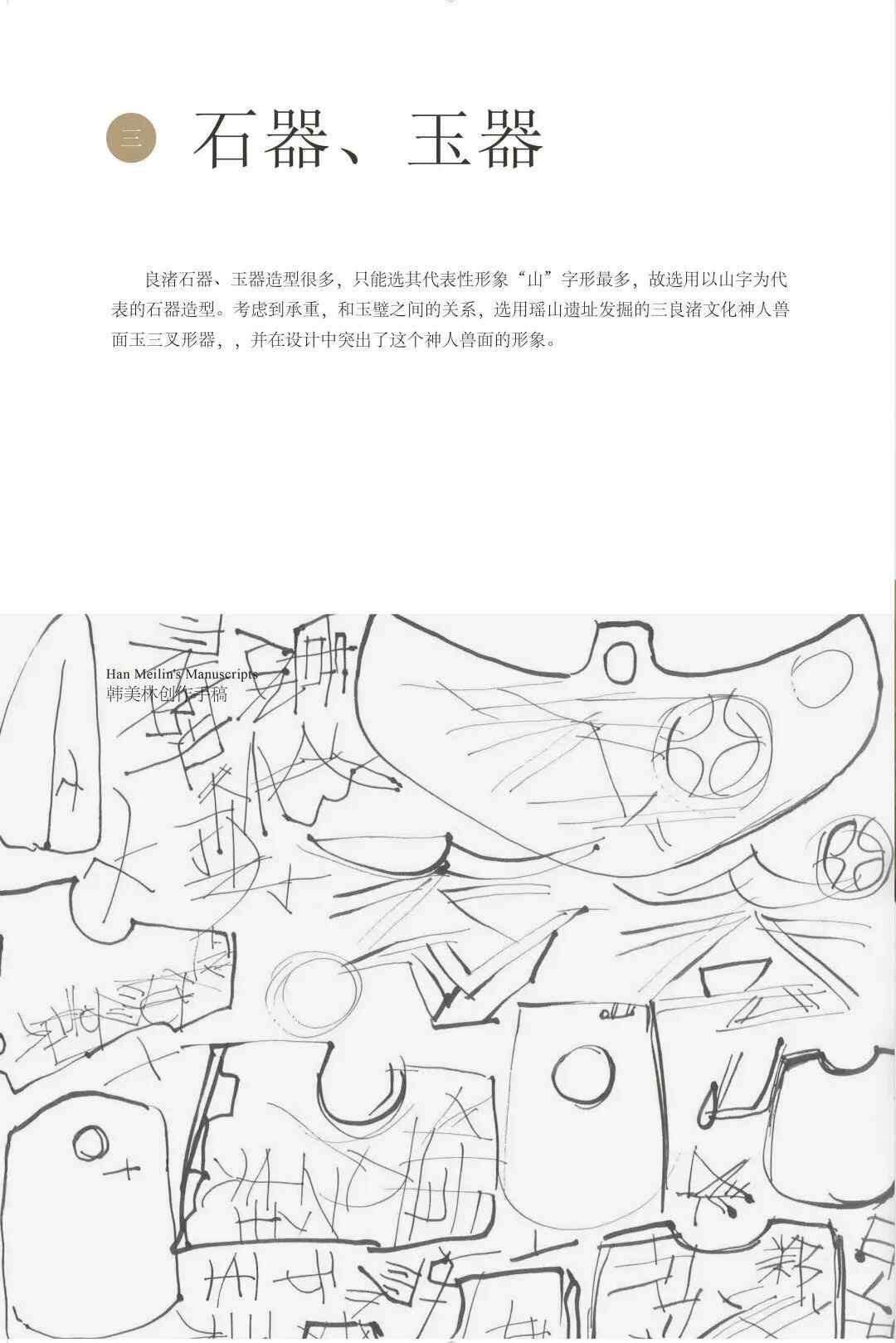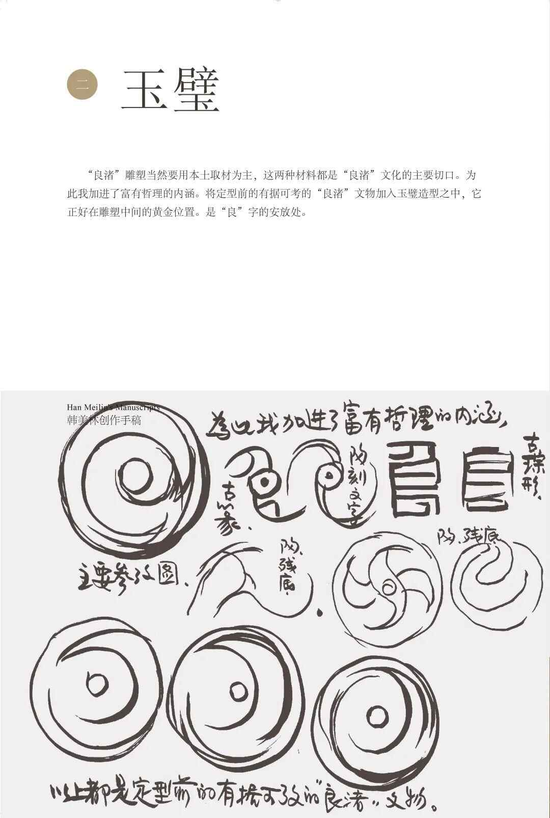 为了使雕塑设计兼具文化内涵和视觉审美,韩美林查阅了大量的相关史料,复印了数百页文物资料,绘制了无数质朴的线条和神秘的文字图案。从具象的火焰、玉器图案,到意象的江南山水,韩美林的手稿本里被各种良渚文化图案填满。