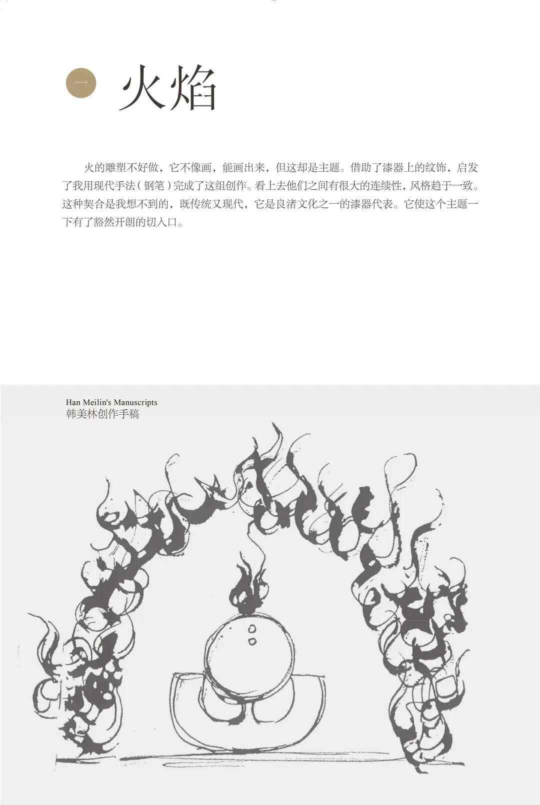 良渚出土的漆器纹饰,启发了韩美林的创作思路。当他看到漆器上的厚重纹饰,立即用钢笔和现代手法完成了一组火焰形象的设计创作。看上去他们之间有很大的连续性,风格趋于一致,这种完美契合,正是韩美林的独创。这组火焰的设计既传统、又现代,既是良渚文明之一的漆器代表,隐约之中仿佛又包含着良渚的“良”字,因此这个主题一下有了豁然开朗的切入口。