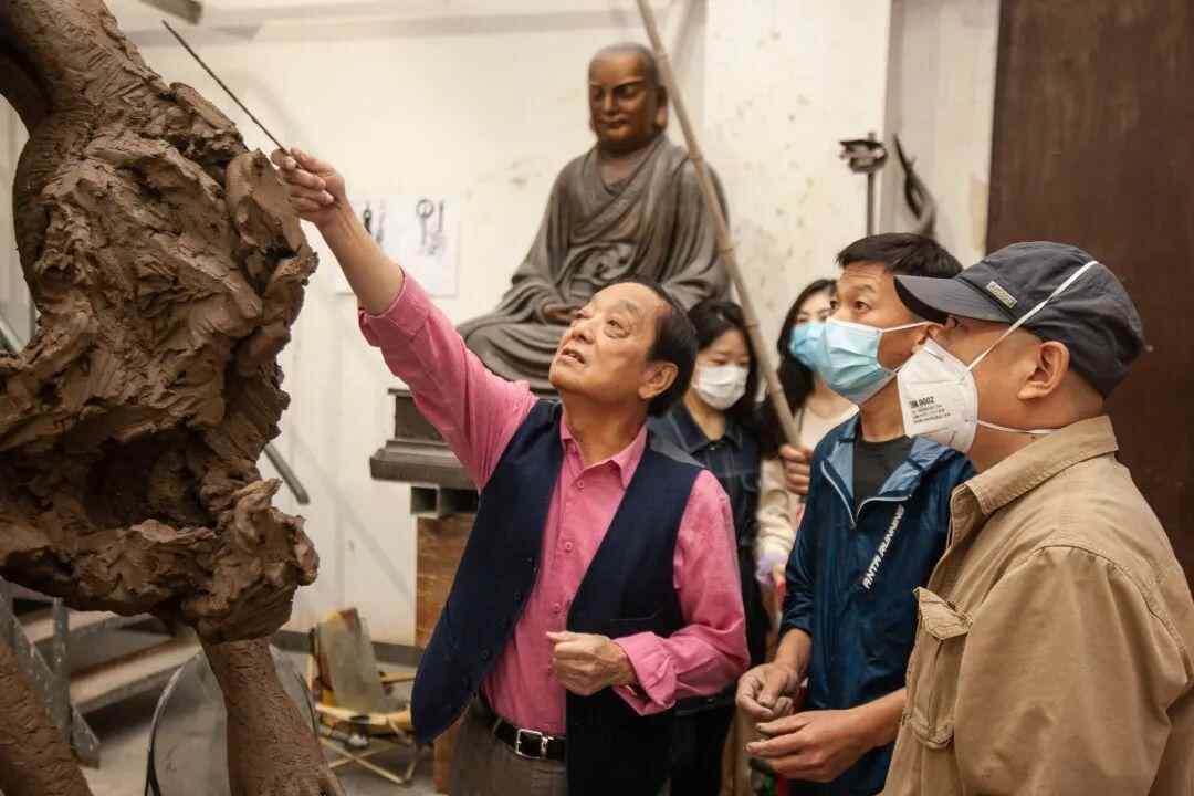 雕塑车间里,也时常看见韩美林沙场点兵的身影。设计稿的不断完善、泥塑小稿的不停修改,“八零后”韩美林精益求精。即使因身体原因住院手术期间,韩美林依然魂牵梦萦于心心念念的良渚雕塑。静谧洁白的病房,那几天成为韩美林的临时创作室。
