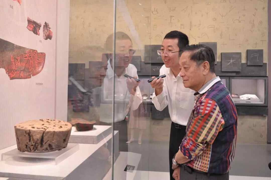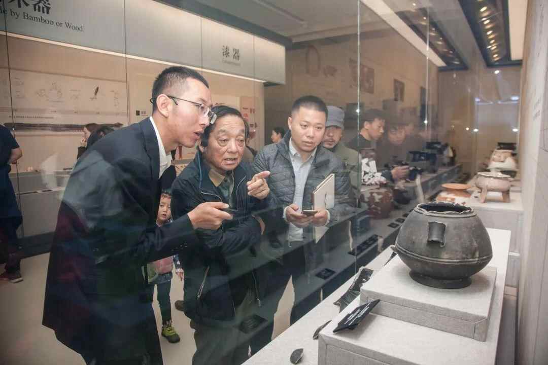 ▲韩美林在良渚博物院仔细聆听讲解员介绍良渚文化