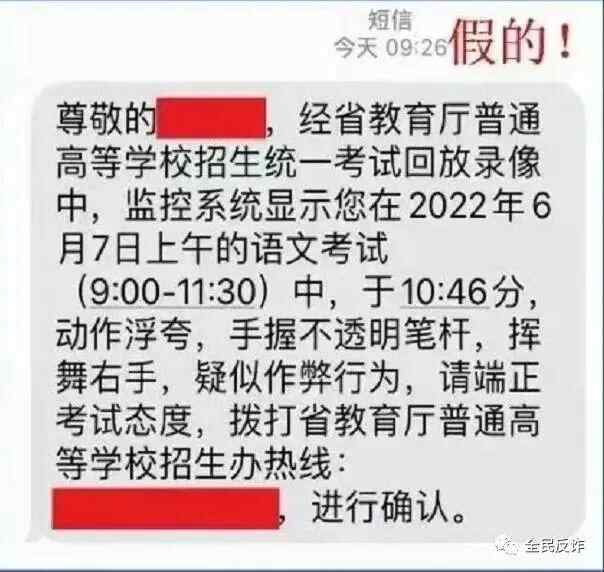 文中称,近日,有群众反映,自己收到了“省教育厅普通高等学校招生办”发来的短信。短信中称在普通高等学校招生统一考试回放录像中,监控显示其有“疑似作弊”行为,要求其拨打省教育厅招生办的电话。