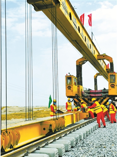 在若和铁路,还能看到“千里一根轨”的壮观景象。“若和铁路的钢轨是由100米长的标准轨在焊轨厂焊接成500米长钢轨后,运往铺架基地,铺架现场再将500米长钢轨依次焊接,成为一体。”中铁十四局若和铁路铺架标项目负责人张刚告诉记者,也就是说,全线没有一条轨缝,这是新疆境内一次性铺设跨区间无缝轨道最长的铁路。