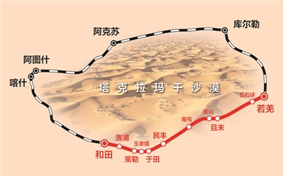 据介绍,若和铁路穿行塔克拉玛干沙漠南缘,约四分之三的路段穿越人迹罕至的沙漠、戈壁,全线风沙段落分布长度超过500公里。