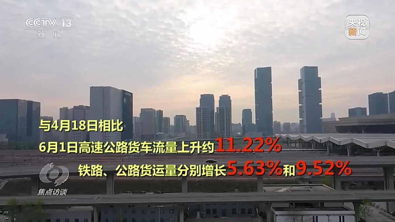 与4月18日相比,6月1日高速公路货车流量上升约11.22%;铁路、公路货运量分别增长5.63%和9.52%,均基本恢复至正常水平。全国邮政快递日均业务量已基本恢复至去年同期水平。