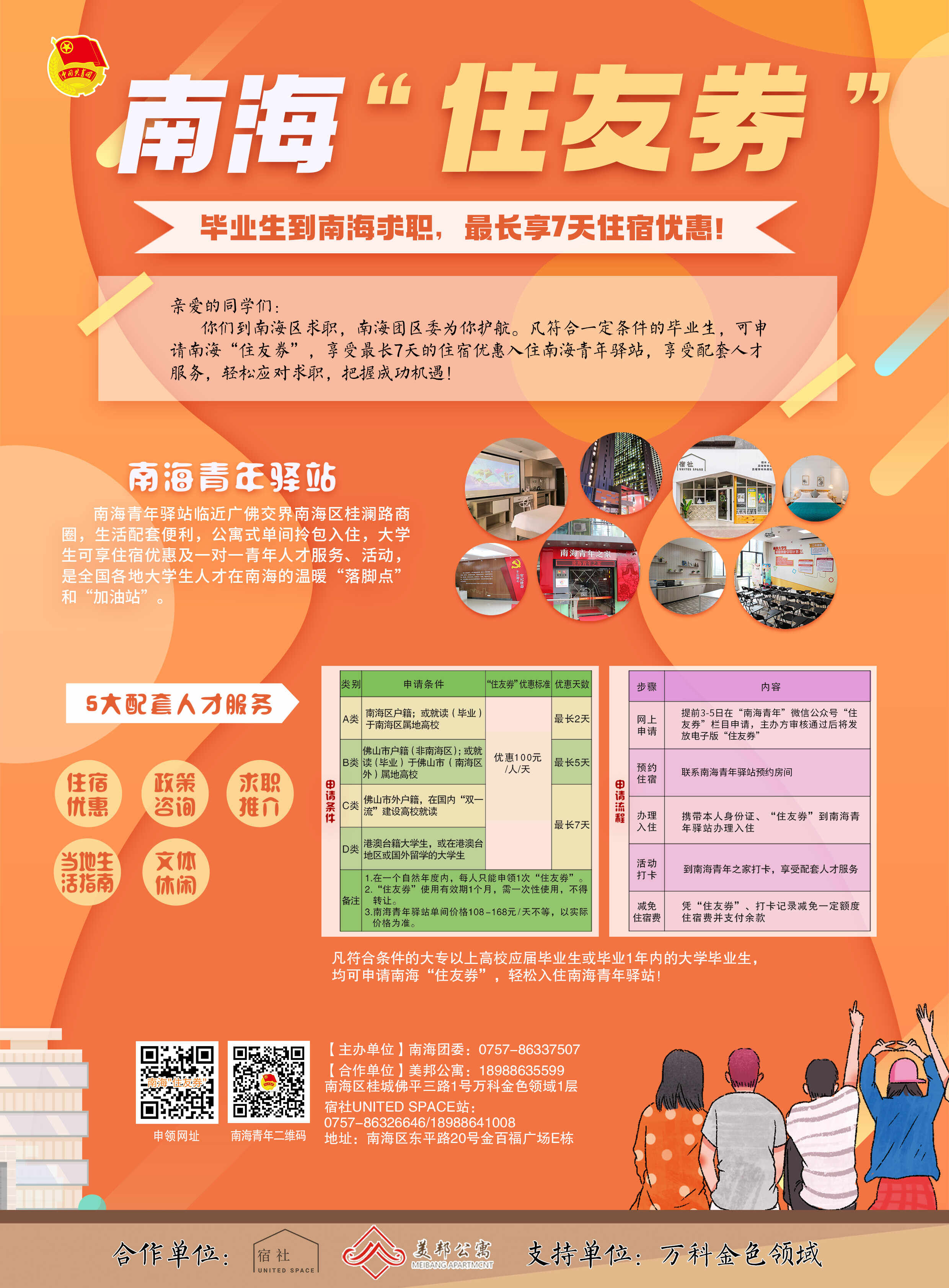 佛山市南海区推出“住友券”,符合条件的大学生人才最多可享受700元公寓住宿补贴。南海区加强与非公有制物业主体合作,在全区建成9家“青年驿站”,提供500个床位,为非本地户籍来佛求职的高校毕业生提供最长7天的优惠住宿。