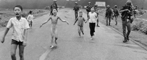 这正是凝固汽油弹的阴损之处。凝固汽油弹英文名为“Napalm”,其字面意思指炸弹中的黏稠剂成分,它可以粘在其他物体上长时间地燃烧,造成持续且难以治愈的伤害。因为这种武器的不人道,凝固汽油弹也被称为“撒旦的唾液”。赤身裸体的小金福一边跑,一边惊叫“太烫了!太烫了!”随她一起逃跑的,还有另外几个小孩,也都是她的亲戚。这一场景恰巧被一位摄影记者拍下,成就了有史以来最著名的战争照片之一,或者说是反战照片。