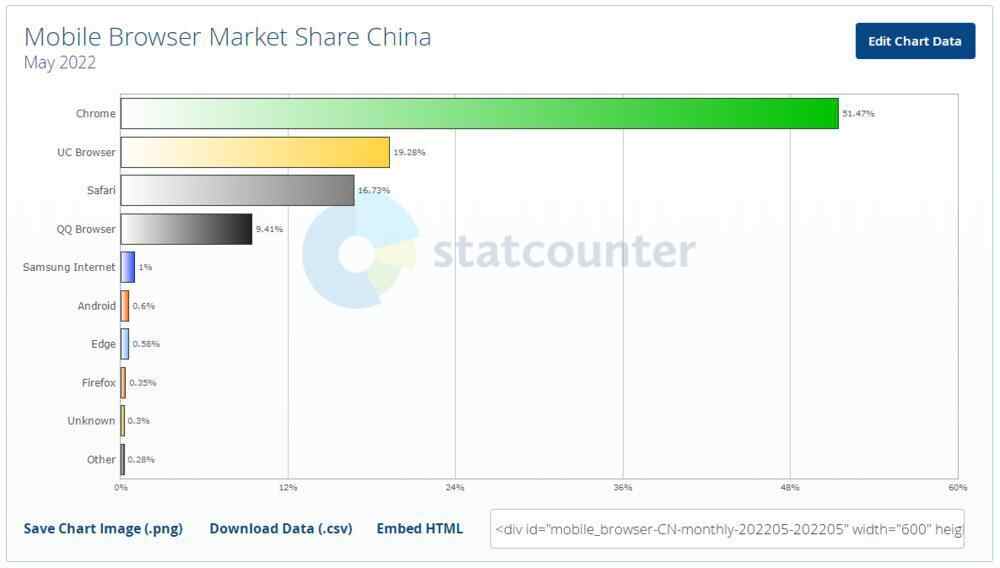 事实上,除了PC端,在移动互联网时代,手机移动端才是一个更大的市场。在这一块,国产浏览器发展迅猛。今年5月,第三方机构StatCounter的数据显示,从市场份额来看,中国最流行的手机浏览器前几名是:Chrome浏览器(51.47%)、UC浏览器(19.28%)、Safari浏览器(16.73%)、QQ浏览器(9.41%)、三星浏览器(1%)。