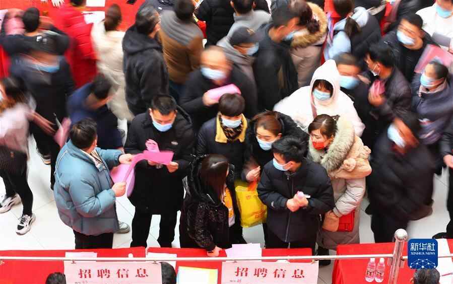 2月19日,求职人员在山东省滕州市“春风送岗”春季人才招聘会上寻找就业岗位。新华社发(李志军 摄)