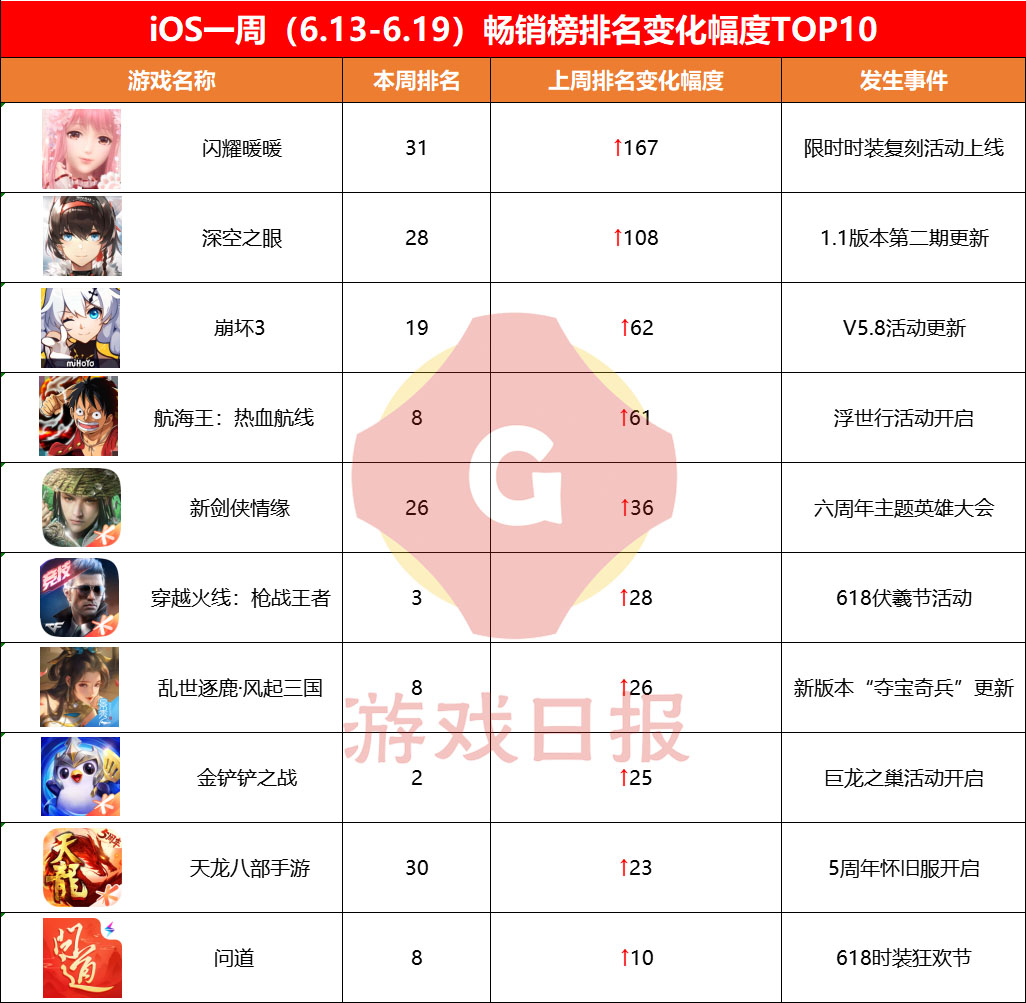 游戏日报整理发现过去一周(6.13-6.19)内,iOS畅销榜Top50有多款产品变化幅度较大。其中叠纸网络旗下产品《闪耀暖暖》因开启限时感应复刻与累充活动,6月16日当天在畅销榜上飙升167位,成为本周榜单排名变化幅度最大游戏。另外勇仕网络旗下《深空之眼》由于1.1版本「迷蝶所归处」第二期更新,更新当日畅销榜排名上升108位。上周iOS畅销榜单排名变动幅度Top10产品如下: