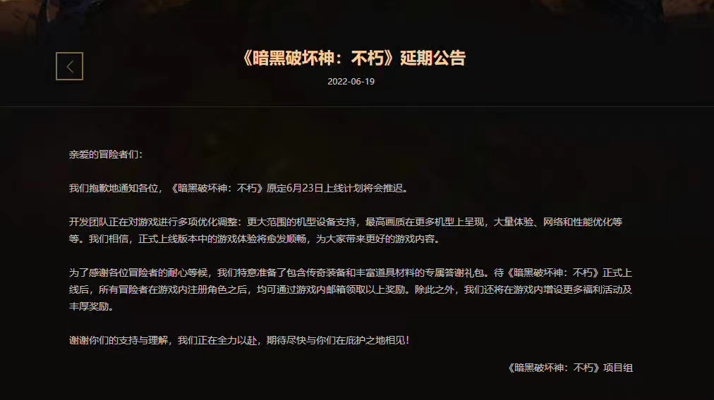 《暗黑破坏神:不朽》国服正式发布延期公告