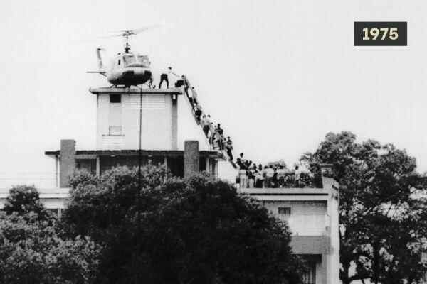 ▲1975年4月19日,北越20万大军将西贡包围得水泄不通,要求所有美国军事顾问必须全部撤离越南。从29日到30日,美国只能用直升机在大使馆顶楼撤离人员,现场一片混乱。