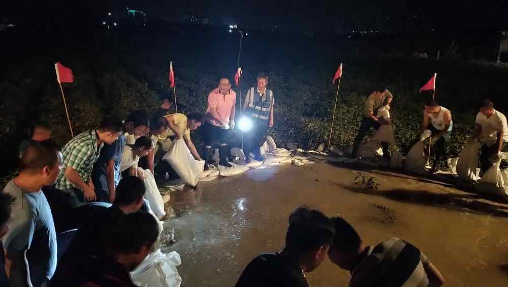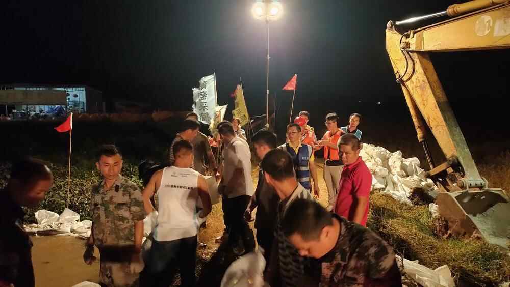 接巡堤人员报告后,石角镇党委主要领导、北江流域局技术人员及专家、第一时间赶赴现场,统一组织调度全镇防汛应急力量、周边村“两委”干部、党员群众、民辅警、供电部门、周边企业人员和北江流域局专业抢险队及机械、车辆等迅速集结,陆续到场,确保人员、物资保障到位。并依据现场实际,对参与抢险人员进行分工、分队,搬运应急物资、铲沙土、装沙袋、运沙包等应急抢险工作紧张有序开展。因铲沙土地点路途较远,需要较多工具车运输沙包,石角镇紧急联动中大时尚科技城建筑工地施工部,临时调用企业3台工具车到场支援,同时派出民警、交警对沿线交通进行疏堵保畅,确保应急物资和沙包以最快速度到达抢险现场。针对北江大堤灵洲Ⅱ段管涌点位附近缺乏照明设施,不利于现场进行应急抢险的问题,随即协调石角镇供电所紧急组织应急照明设施从大堤绿地分布排列到管涌点。当晚,共出动250余人,抢险物资纤维包12000只、粗砂25立方米、反滤料30立方米、挖掘机5台、工具车9辆、龙马货车2辆、应急照明灯20套。