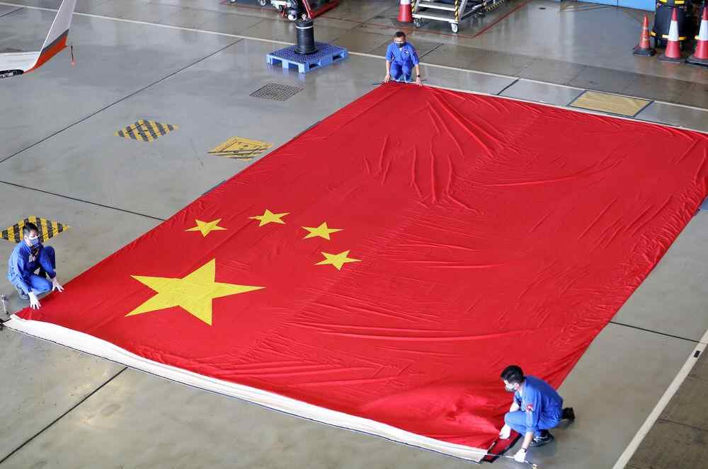 香港特区政府飞行服务队工程部的技术人员在整理国旗(6月20日摄)。新华社记者 李钢 摄