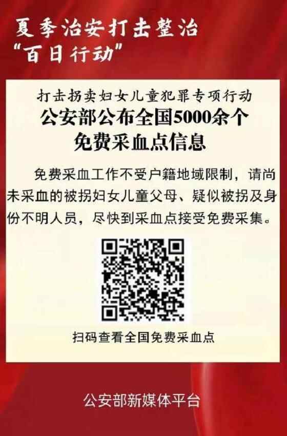 据了解,公安部新媒体平台、公安部刑侦局微信公众号和官方微博、公安部儿童失踪信息紧急发布平台已集中发布5000余个免费采血点信息,可及时查询全国采血点情况。